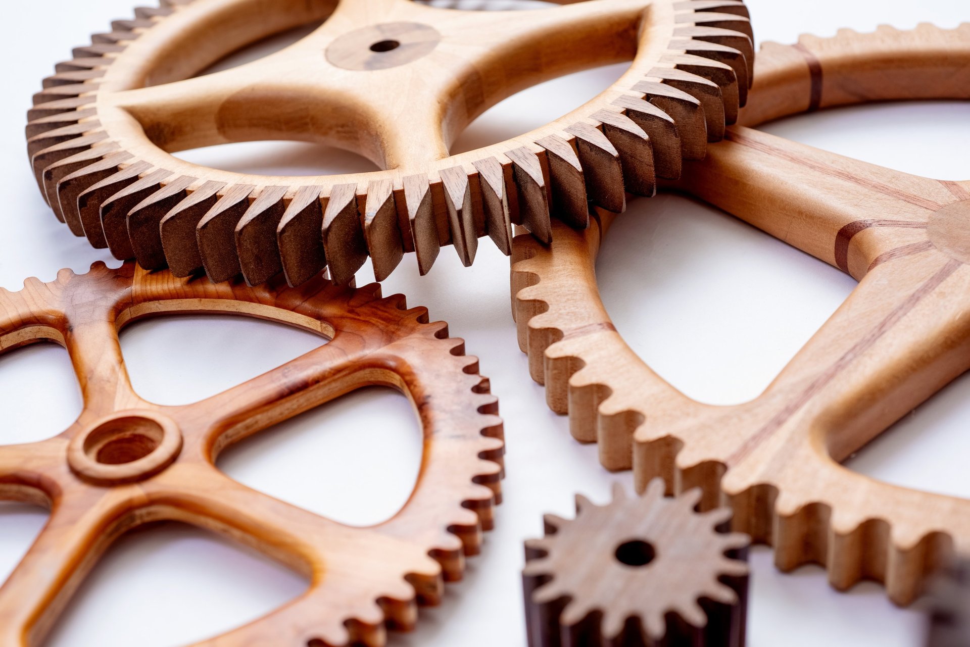 M-14 Harrison. Arbor Vitae root balls (gears) Big Leaf Figured Maple, American Holly, Katalux and Brass.