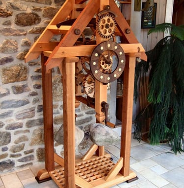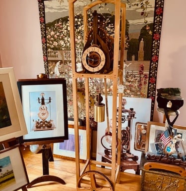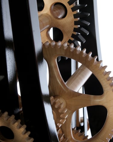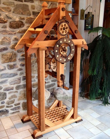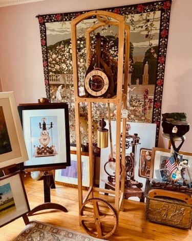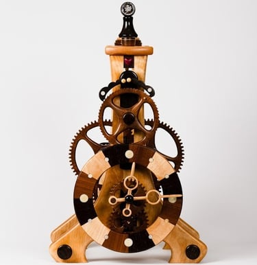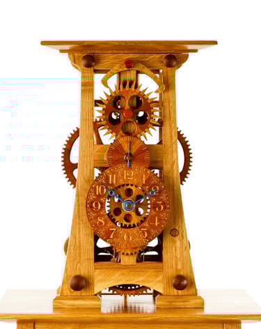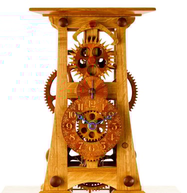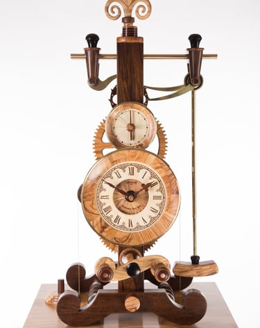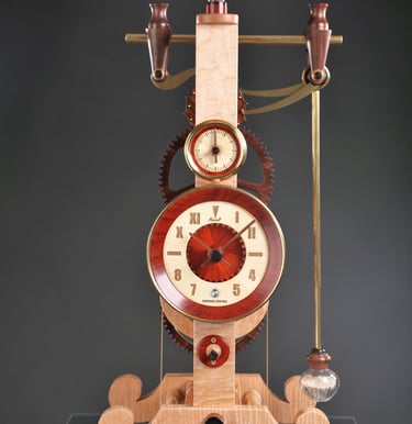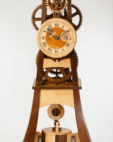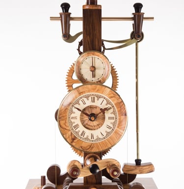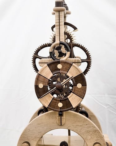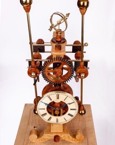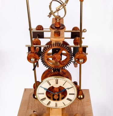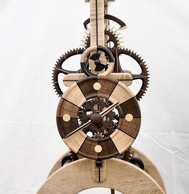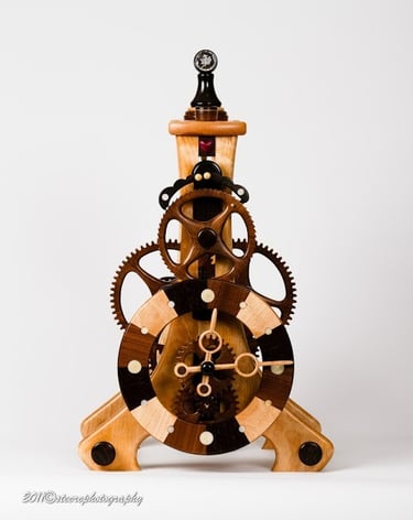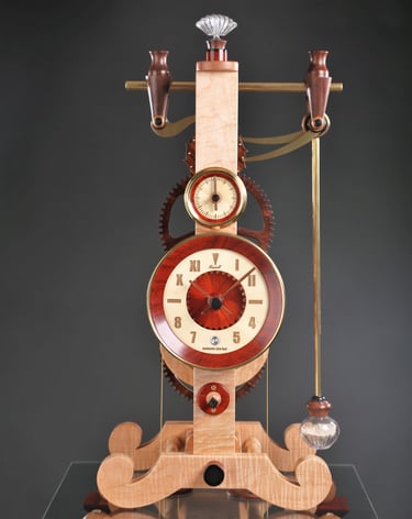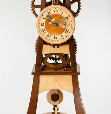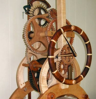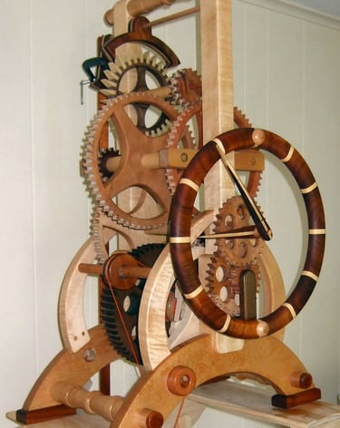 You may ask, where is the M1? The M1 did exist and, along with the M2, was used as a training project when I first started learning how to design and build a wood wheels clock. By popular demand I kept the M2 alive. Neither the M1 or M2 were slated for a show room! In fact, I destroyed the M1 fearing that I might be judged by its appearance. Trust me, it was not ready for a public viewing! The M2 does have beautiful woods in its construction and I was convinced to allow it to survive!