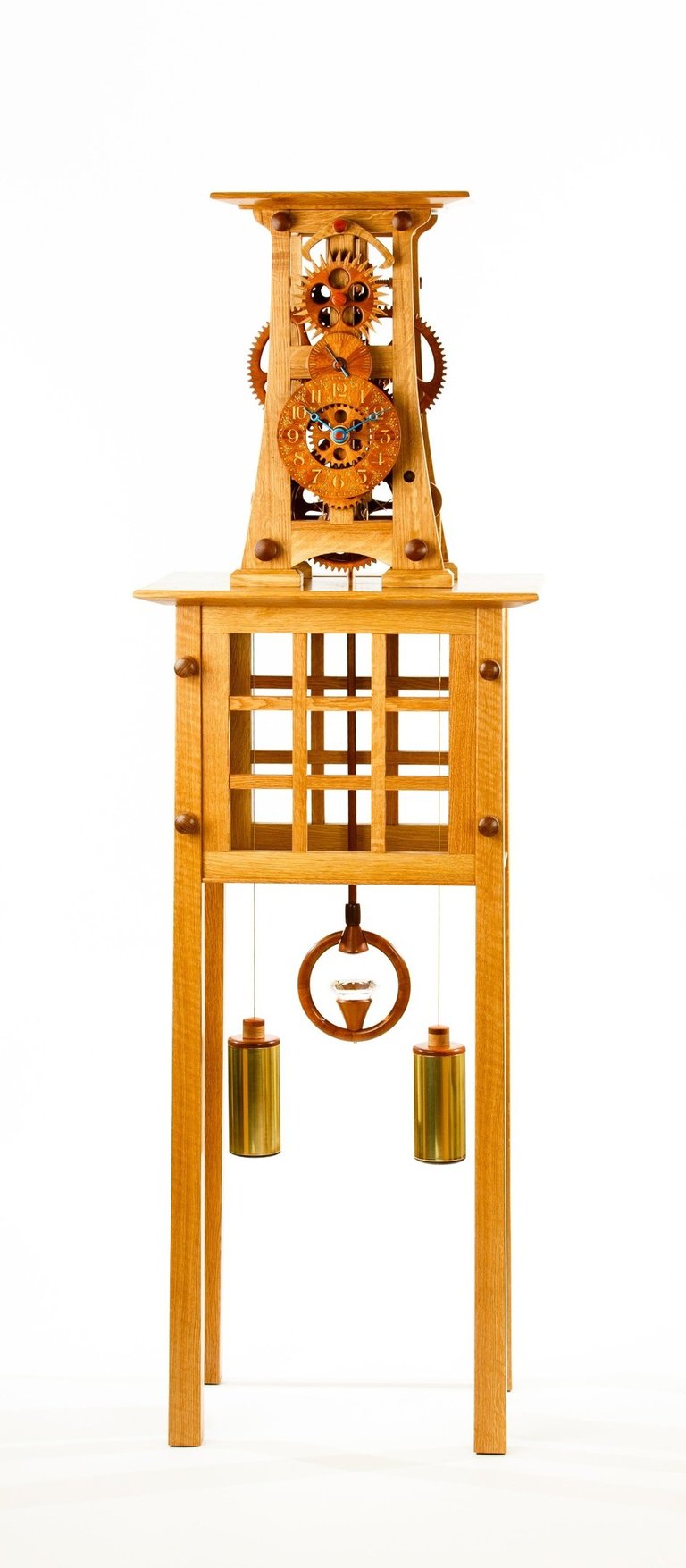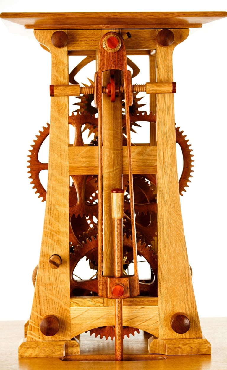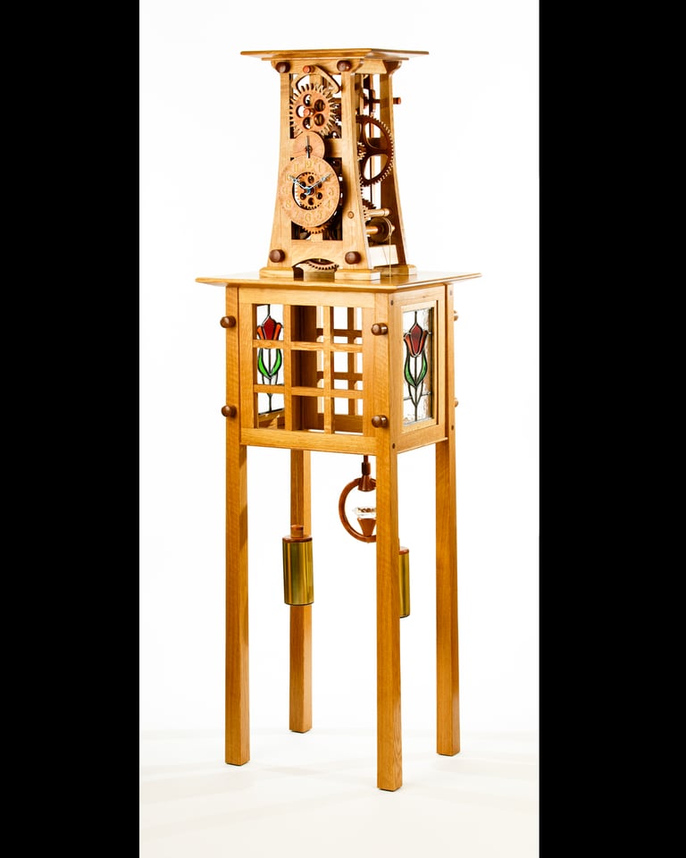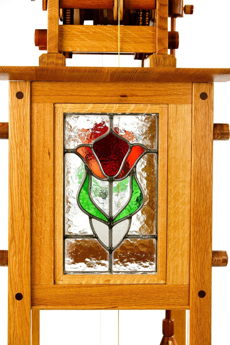 This is my tenth clock. I started building all-wooden gears clocks after retiring from 25 years of service in the US Navy (retired in Dec 2006). The first wooden clock was inspired by a similar all-wooden gears clock that I witnessed in a Cape Cod Arts Museum while on honeymoon in November 1982. I told my wife then, "Someday I will build you one of these beautiful clocks." She chuckled at the thought. Twenty-five years later and a wake-up call I made good on my promise. That promised clock is labeled M-3 on this website www.hardwoodclocks.com . This current clock (M10) fulfills my second promise which is to build one for each of my adult children upon their marriage. This clock is for my daughter Patti Rose who married in October 2014. My choice of Mission styling comes from the many requests I get for a clock of this type. The stained glass inserts on the support bench were acquired while on active duty and assigned to COMNAVEUR, London, UK. Adding these 1920's stained glass pieces to the bench was the perfect use for them. The leaded crystal in the pendulum bob was found and purchased at an art museum in Richmond, Virginia. The bob itself is fashioned in a circle to honor the unconditional love in marriage. An inscription under the bench top reads, "Above all, always cherish each other."