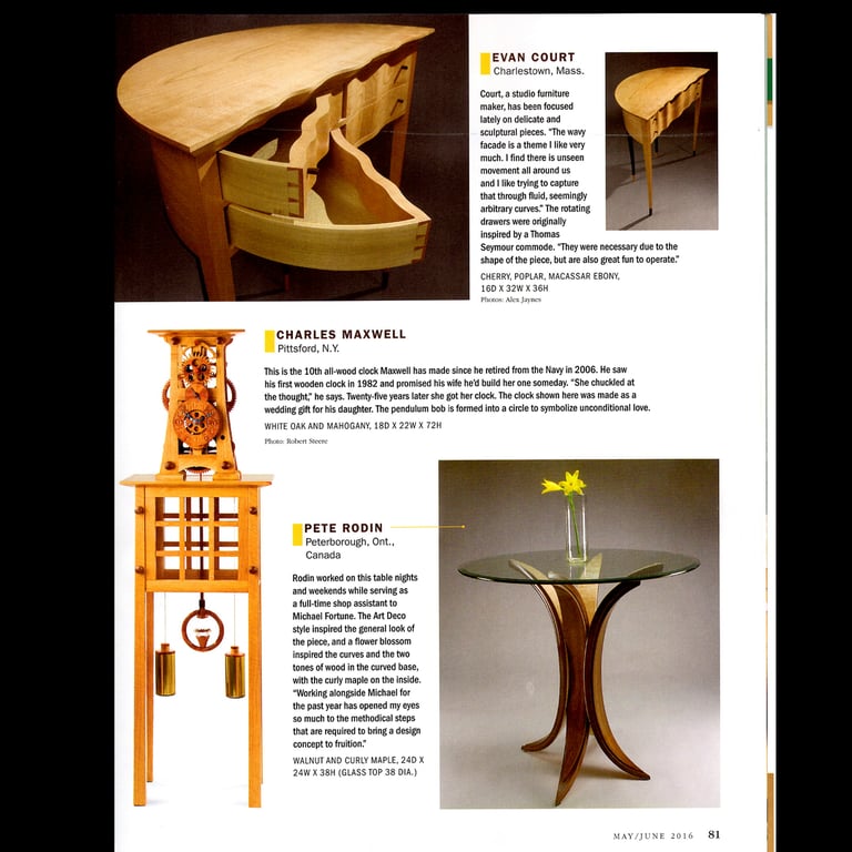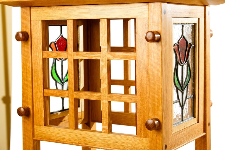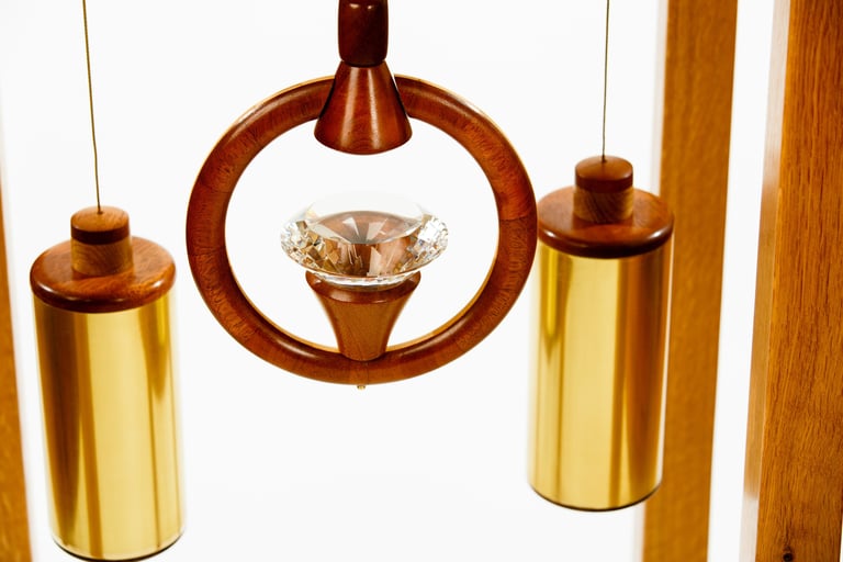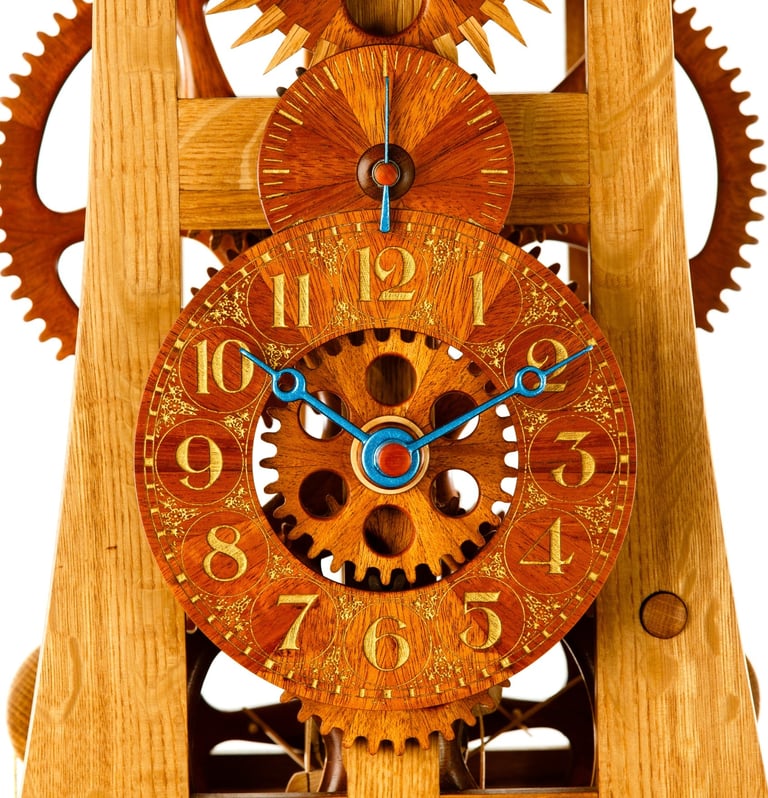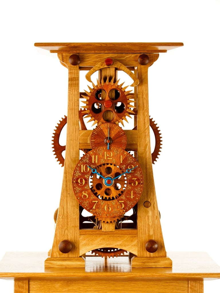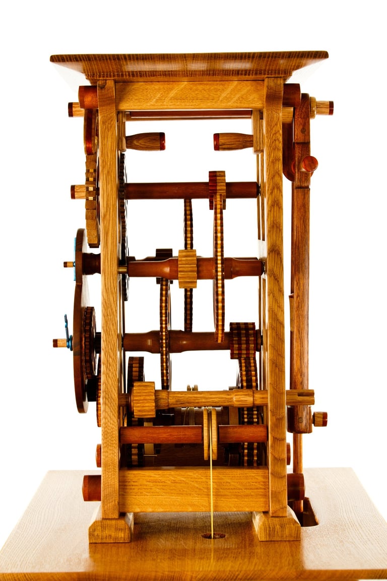 This is my tenth clock. I started building all-wooden gears clocks after retiring from 25 years of service in the US Navy (retired in Dec 2006). The first wooden clock was inspired by a similar all-wooden gears clock that I witnessed in a Cape Cod Arts Museum while on honeymoon in November 1982. I told my wife then, "Someday I will build you one of these beautiful clocks." She chuckled at the thought. Twenty-five years later and a wake-up call I made good on my promise. That promised clock is labeled M-3 on this website www.hardwoodclocks.com . This current clock (M10) fulfills my second promise which is to build one for each of my adult children upon their marriage. This clock is for my daughter Patti Rose who married in October 2014. My choice of Mission styling comes from the many requests I get for a clock of this type. The stained glass inserts on the support bench were acquired while on active duty and assigned to COMNAVEUR, London, UK. Adding these 1920's stained glass pieces to the bench was the perfect use for them. The leaded crystal in the pendulum bob was found and purchased at an art museum in Richmond, Virginia. The bob itself is fashioned in a circle to honor the unconditional love in marriage. An inscription under the bench top reads, "Above all, always cherish each other."