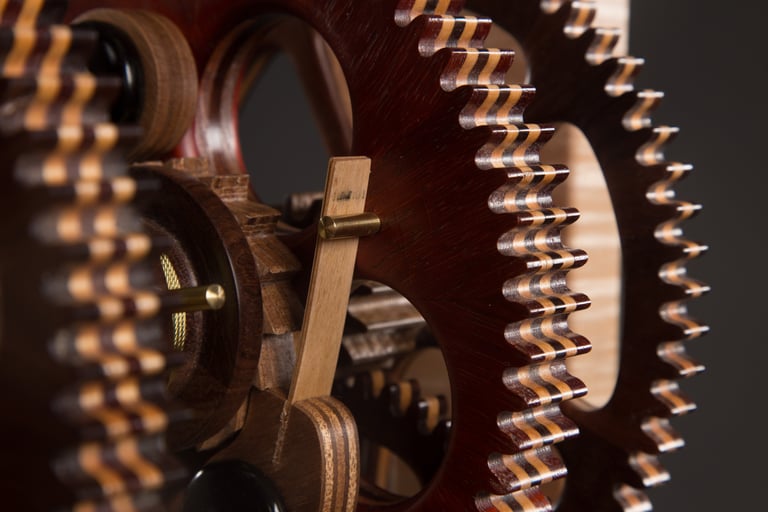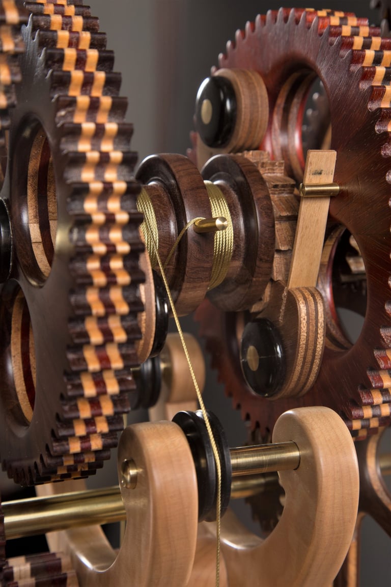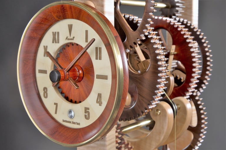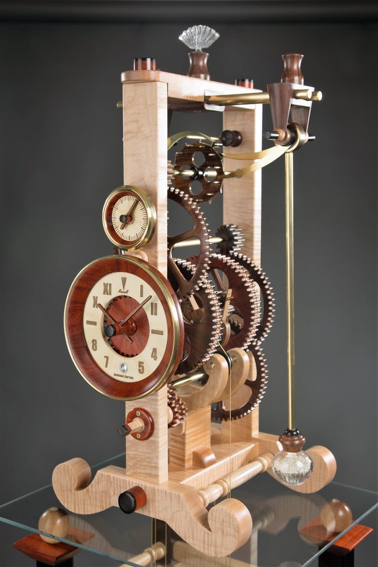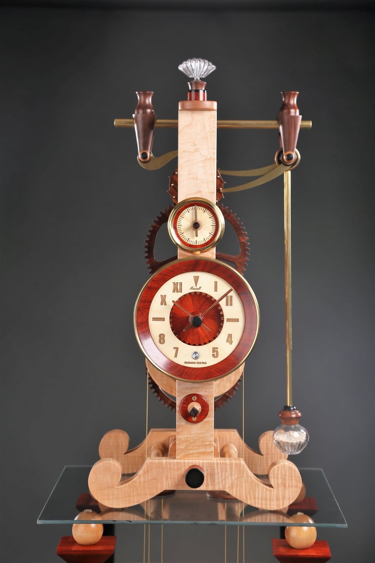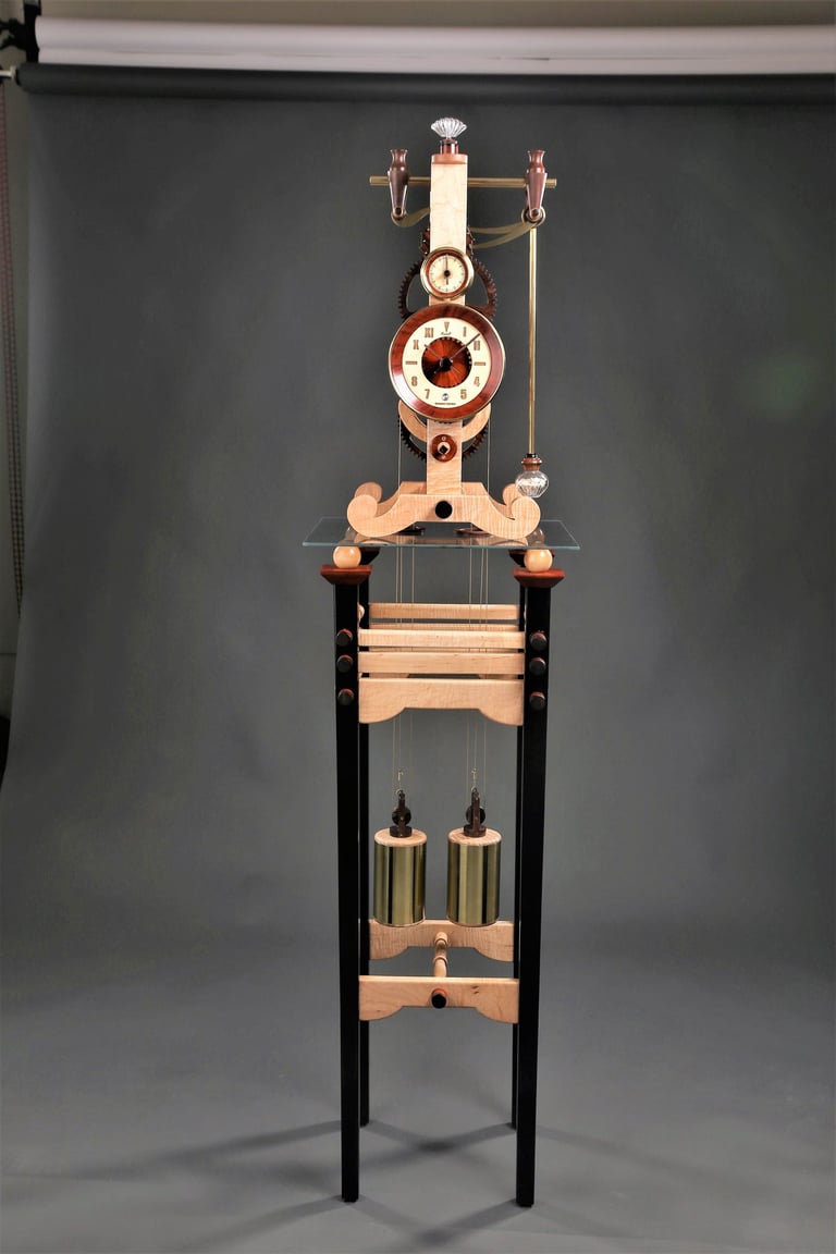 This is the first of two Galileo designs that I have built. This one belongs to my oldest daughter. I wanted to capture her personality in this design. Note the combination of Roman and Arabic numbers in the face. That was a preference I noted when she was looking at watches in a boutique window. The glass top and the bench legs are also comments on her creative and artistic personality. The pendulum bob is a repurposed crystal perfume bottle that I filled with sand from the Key West beaches where her wedding was held.