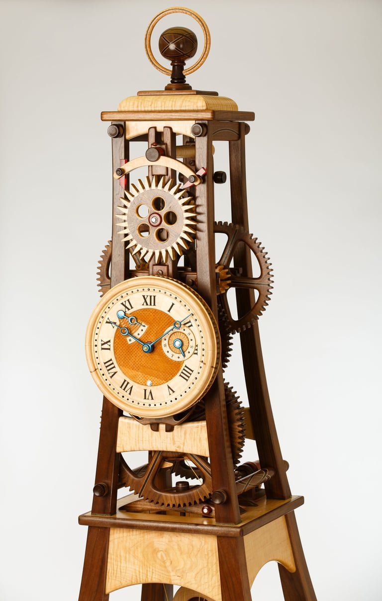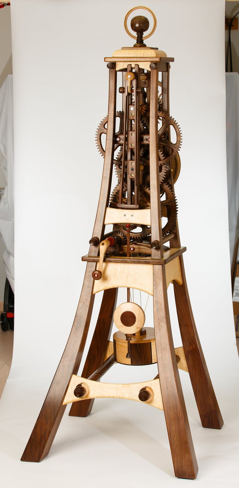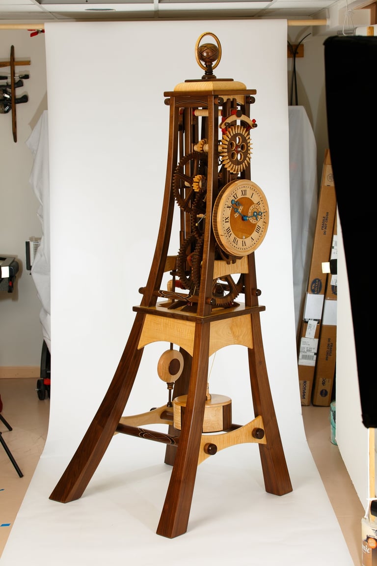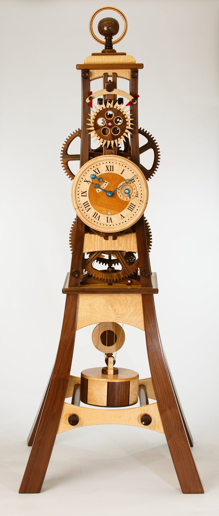The M12 was a year long project designed in close coordination with its owner. The object was to create a masterpiece fashioned after the Eifel Tower and include features seen in French Breguet watches. Notable are the Swarovski crystals on the face and the blue painted hands typical of Breguet watches. What may not be obvious is the methods used for obtaining the 3D cut legs. I don't use CAD or CNC tools. That entire structure is completely hand carved. It took the better part of summer to accomplish that carving. When asked by another client if I could reproduced the M12 for him, I answered, "I can reproduce anything but, I don't want to!" We moved onto another design!