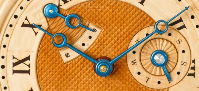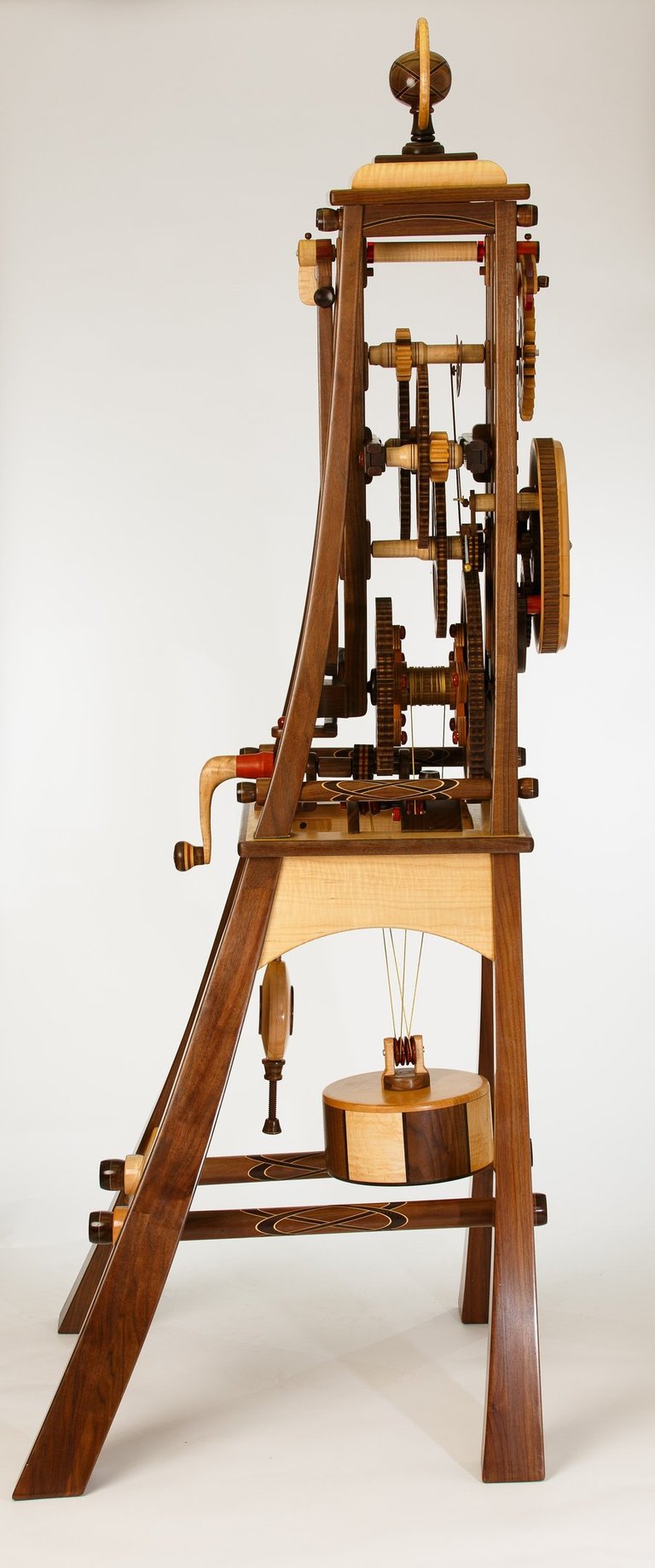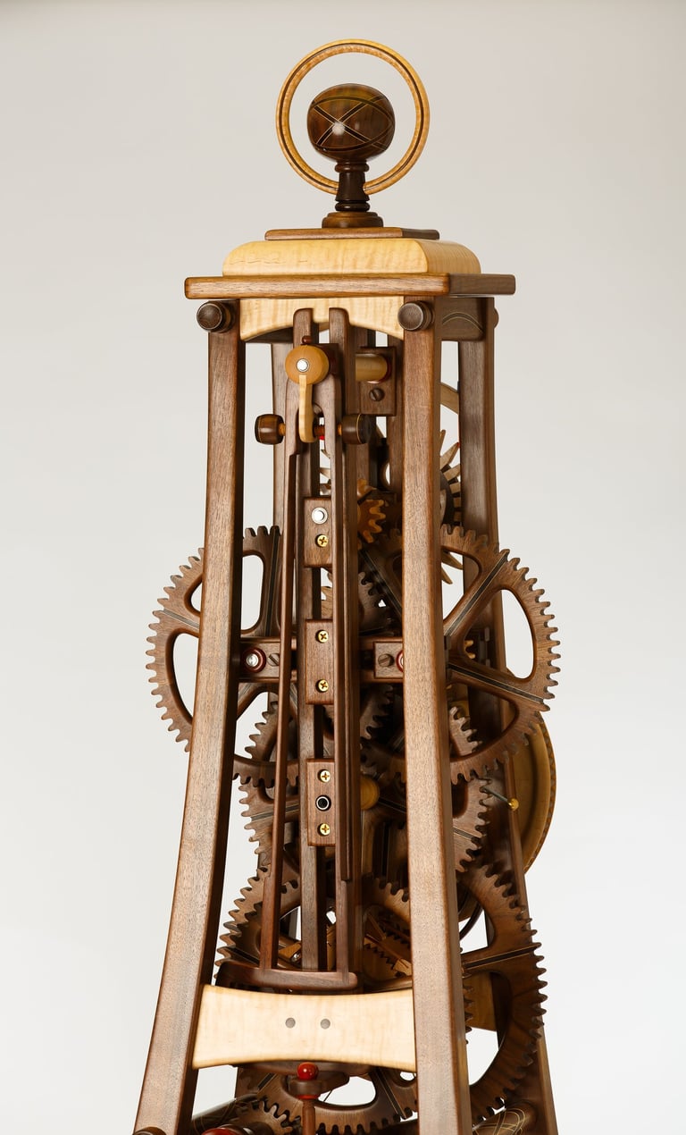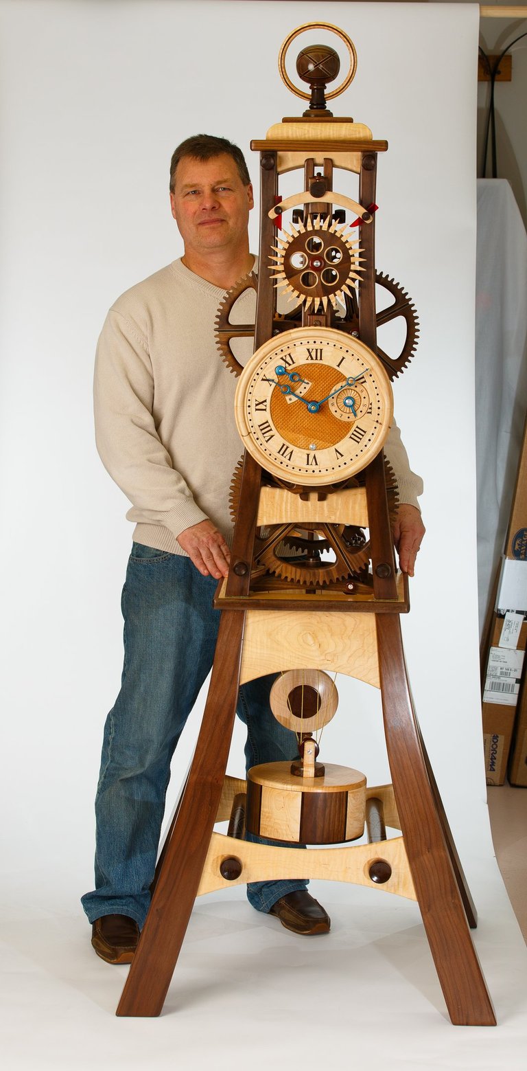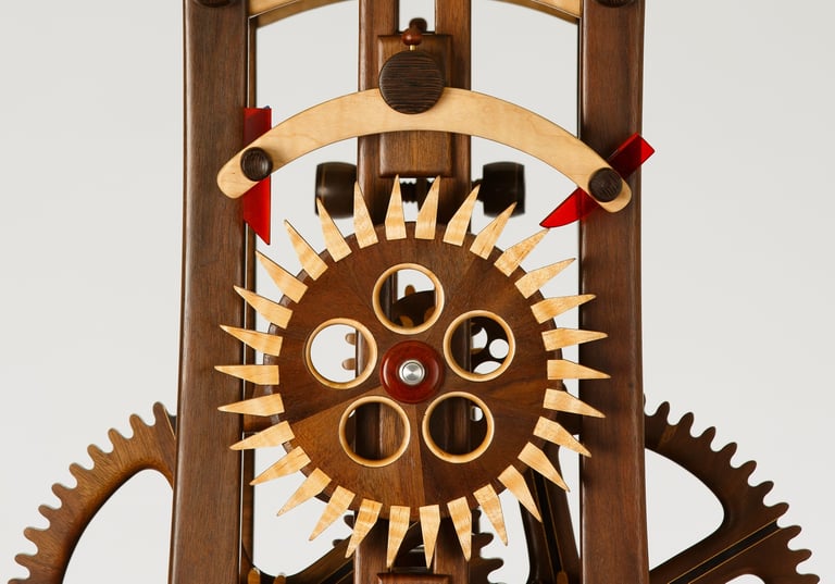 The M12 was a year long project designed in close coordination with its owner. The object was to create a masterpiece fashioned after the Eifel Tower and include features seen in French Breguet watches. Notable are the Swarovski crystals on the face and the blue painted hands typical of Breguet watches. What may not be obvious is the methods used for obtaining the 3D cut legs. I don't use CAD or CNC tools. That entire structure is completely hand carved. It took the better part of summer to accomplish that carving. When asked by another client if I could reproduced the M12 for him, I answered, "I can reproduce anything but, I don't want to!" We moved onto another design!