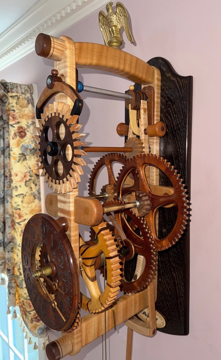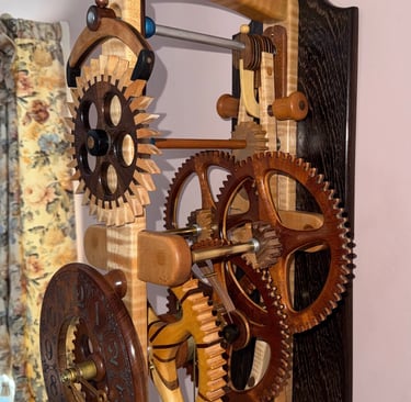 This clock is a mashup of idle parts/gears I had lying around the shop in boxes. Putting those parts into a wall hanging design wasn't too difficult and went together quickly. I gave this clock to a rather deserving man who also does laser etching for my clock faces. He wouldn't take payment for all his service. So, this free clock was my way of saying thank you.