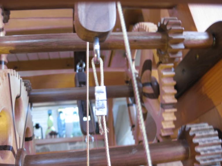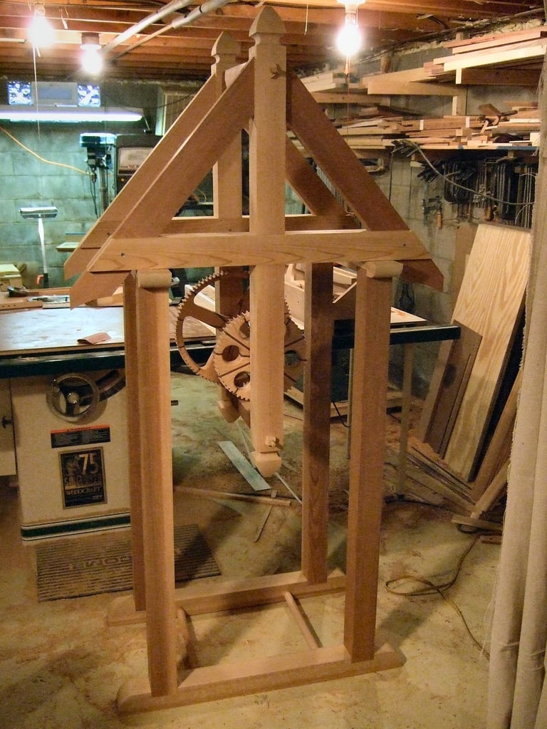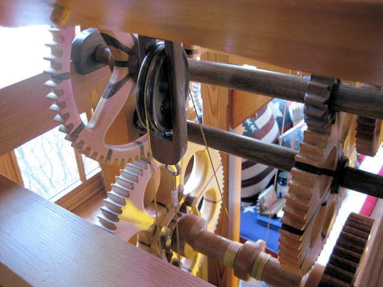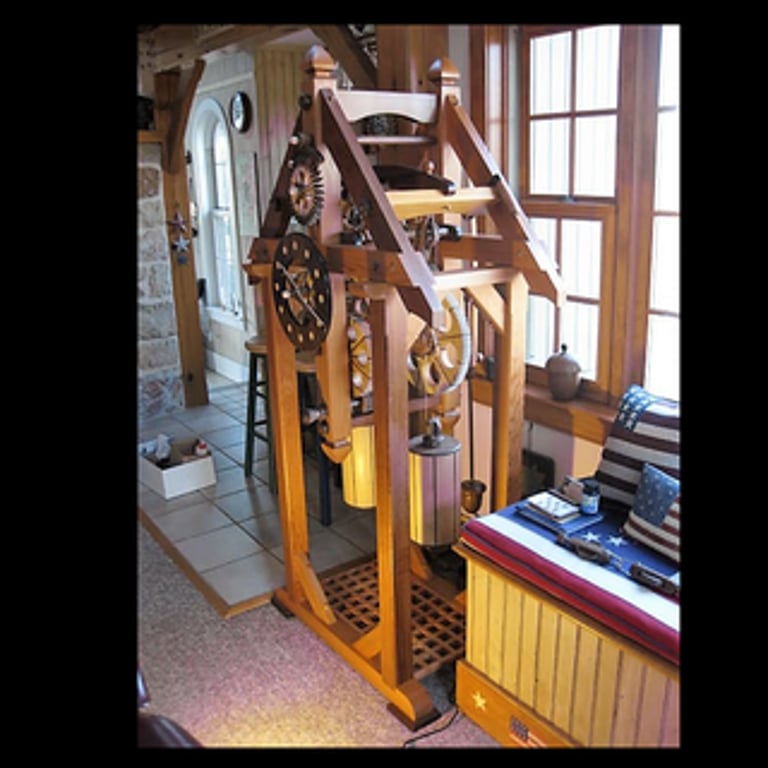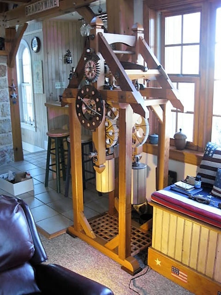This M4 clock was the result of a long collaboration with its owner. The original idea for the 'stone' weights (see the first photo) was an attempt to share in the majesty of the enormous stone fireplace near the clock's installed location. Those stones came from Sodus Point on the New York side of Lake Ontario and they are heavy. The stones were soon replaced! This clock stands about 7 feet tall and is created with amazing cedar timbers that fit perfectly in its timber frame home.
