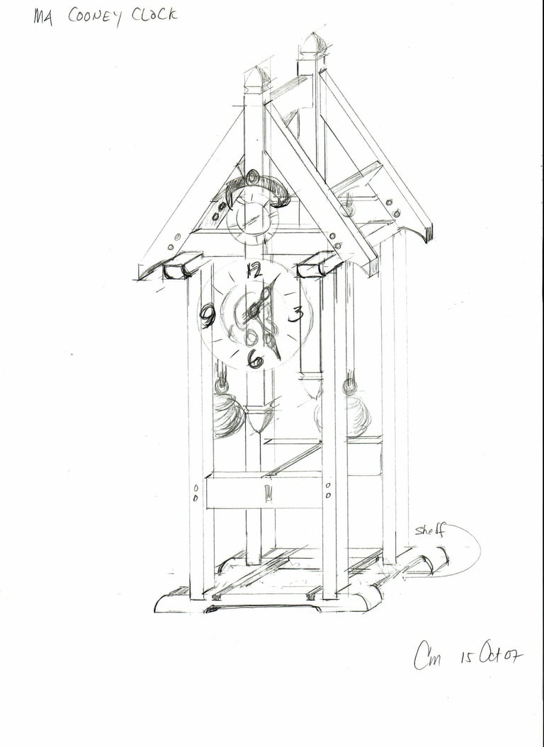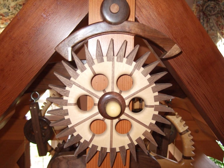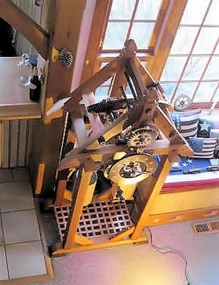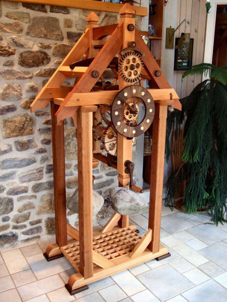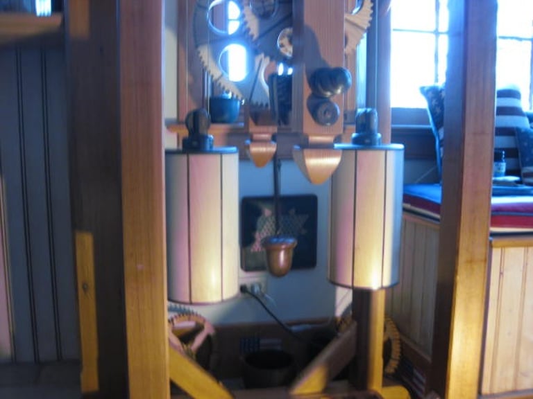 This M4 clock was the result of a long collaboration with its owner. The original idea for the 'stone' weights (see the first photo) was an attempt to share in the majesty of the enormous stone fireplace near the clock's installed location. Those stones came from Sodus Point on the New York side of Lake Ontario and they are heavy. The stones were soon replaced! This clock stands about 7 feet tall and is created with amazing cedar timbers that fit perfectly in its timber frame home.