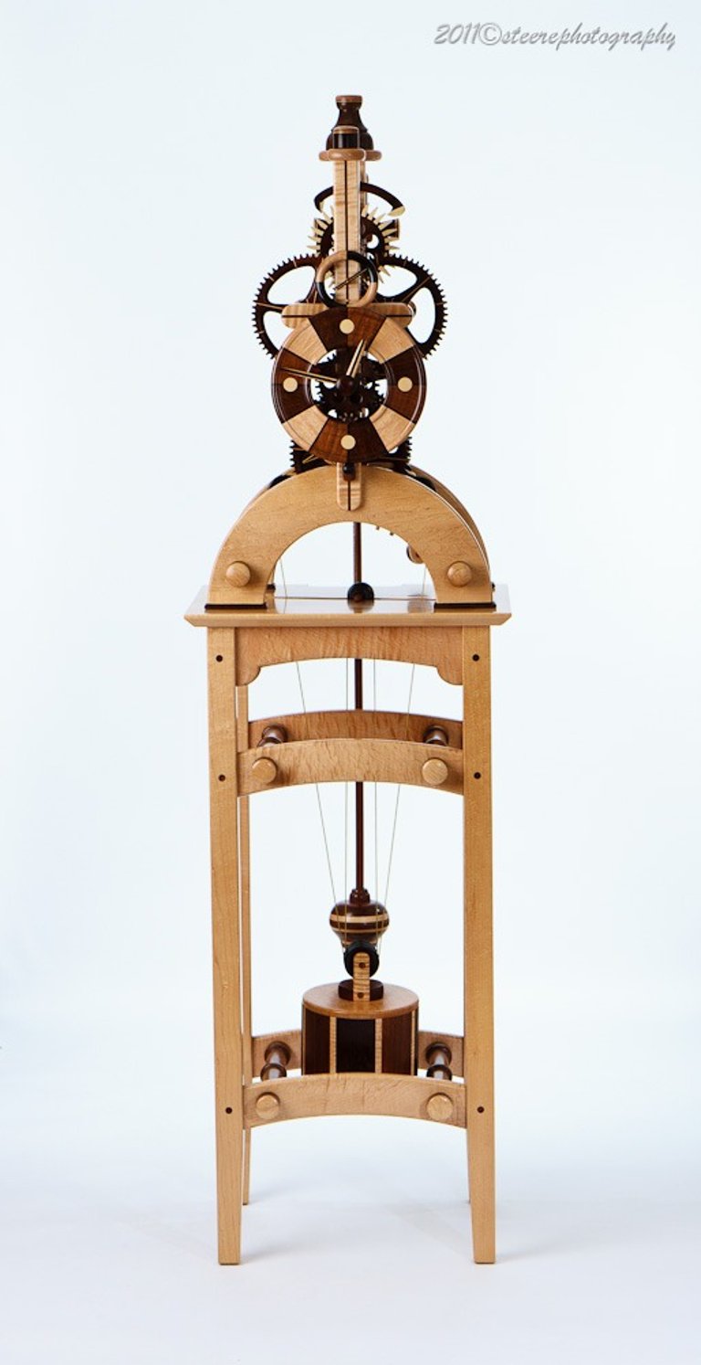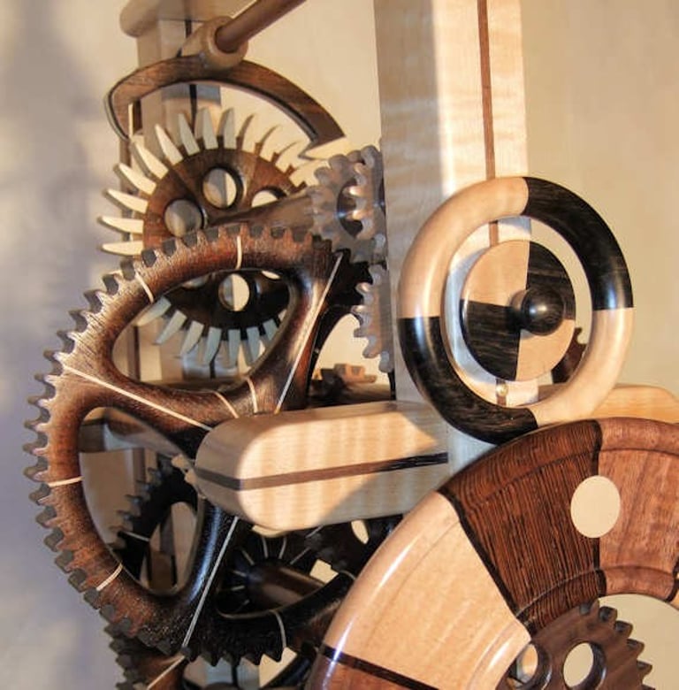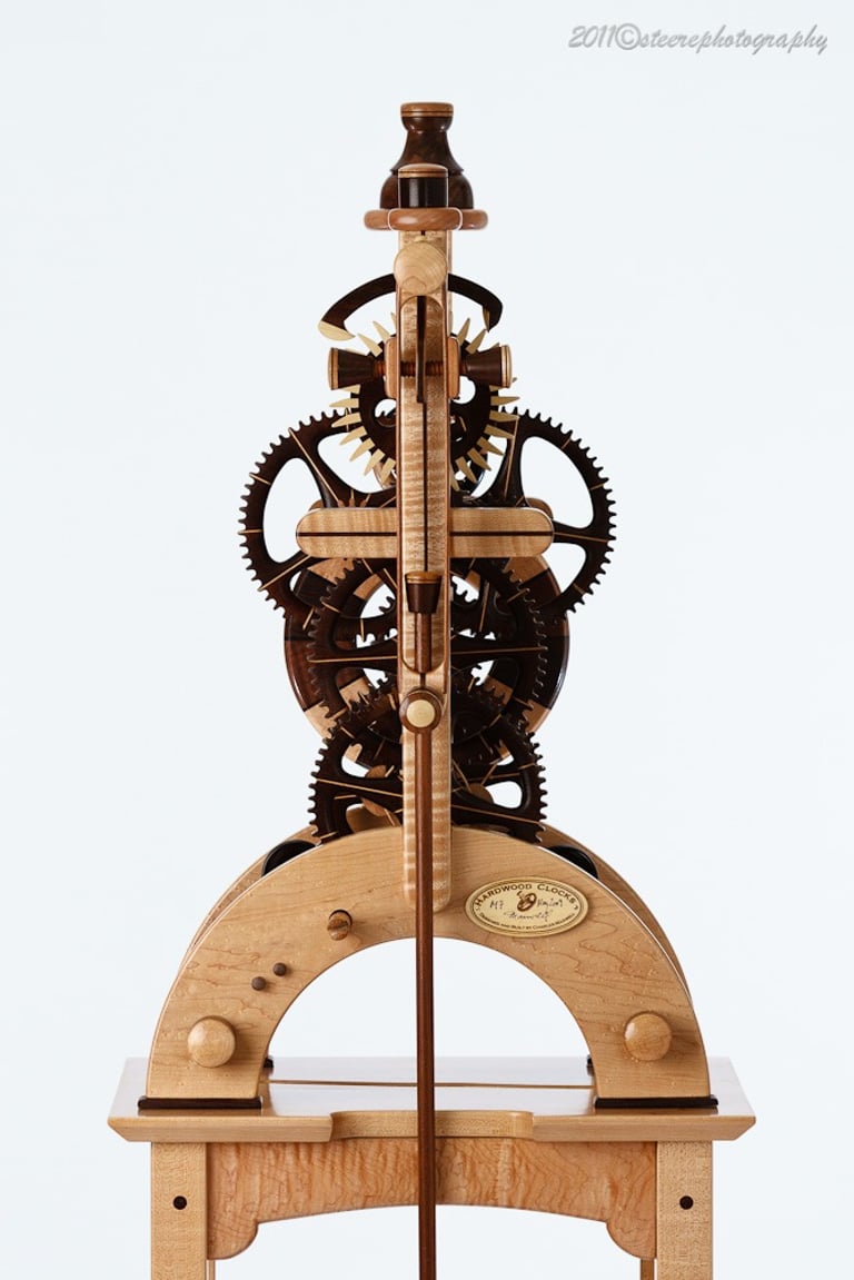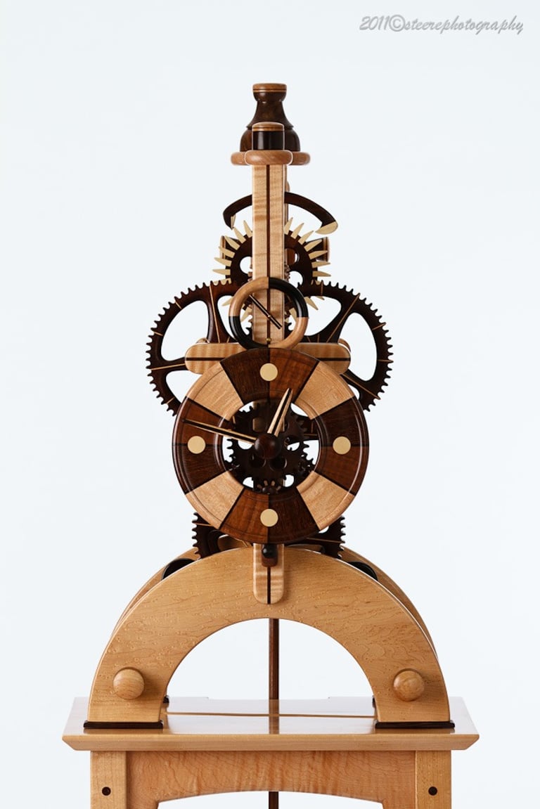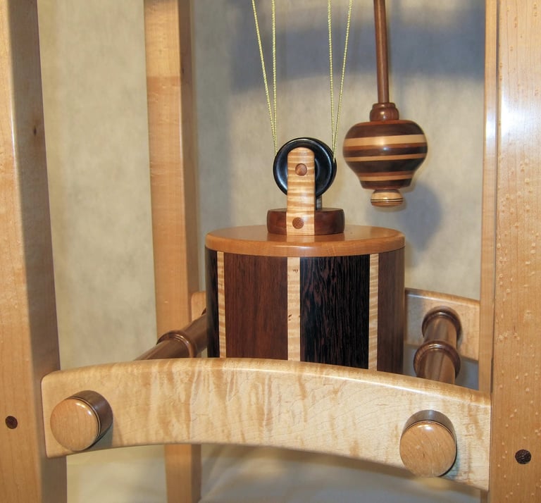 I call this clock Brown Sugar because the chocolate tones in the various wood combinations looks like, well, Brown Sugar! This clock was a collaborative effort with a local Rochester resident. The colorful pendulum bob was a throw away until the owner saw it in the trash and decided, it's perfect! I was hesitant to include it but, after a few days it grew on me. I like it!