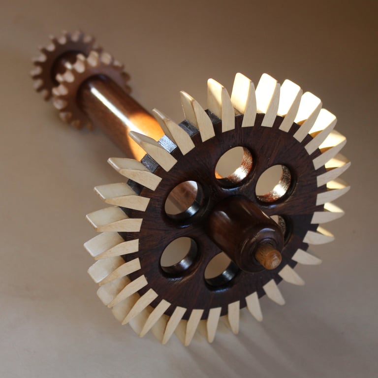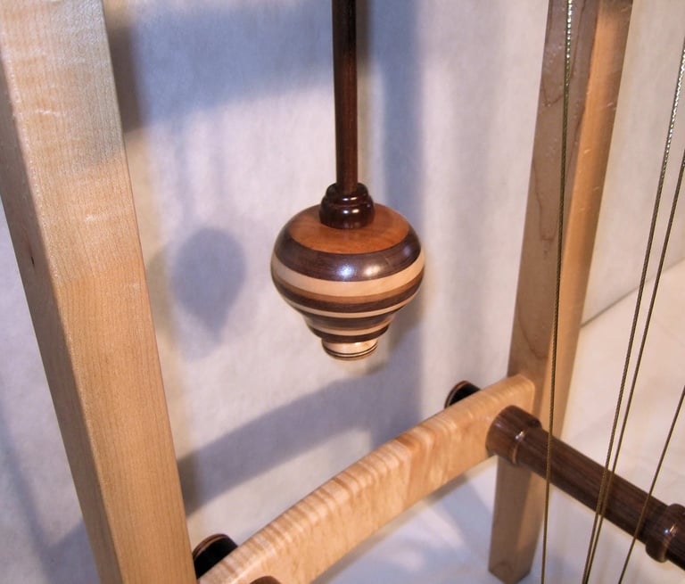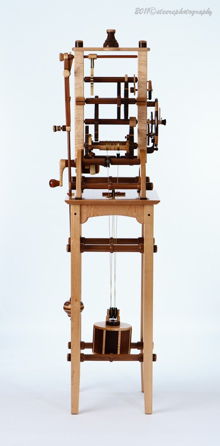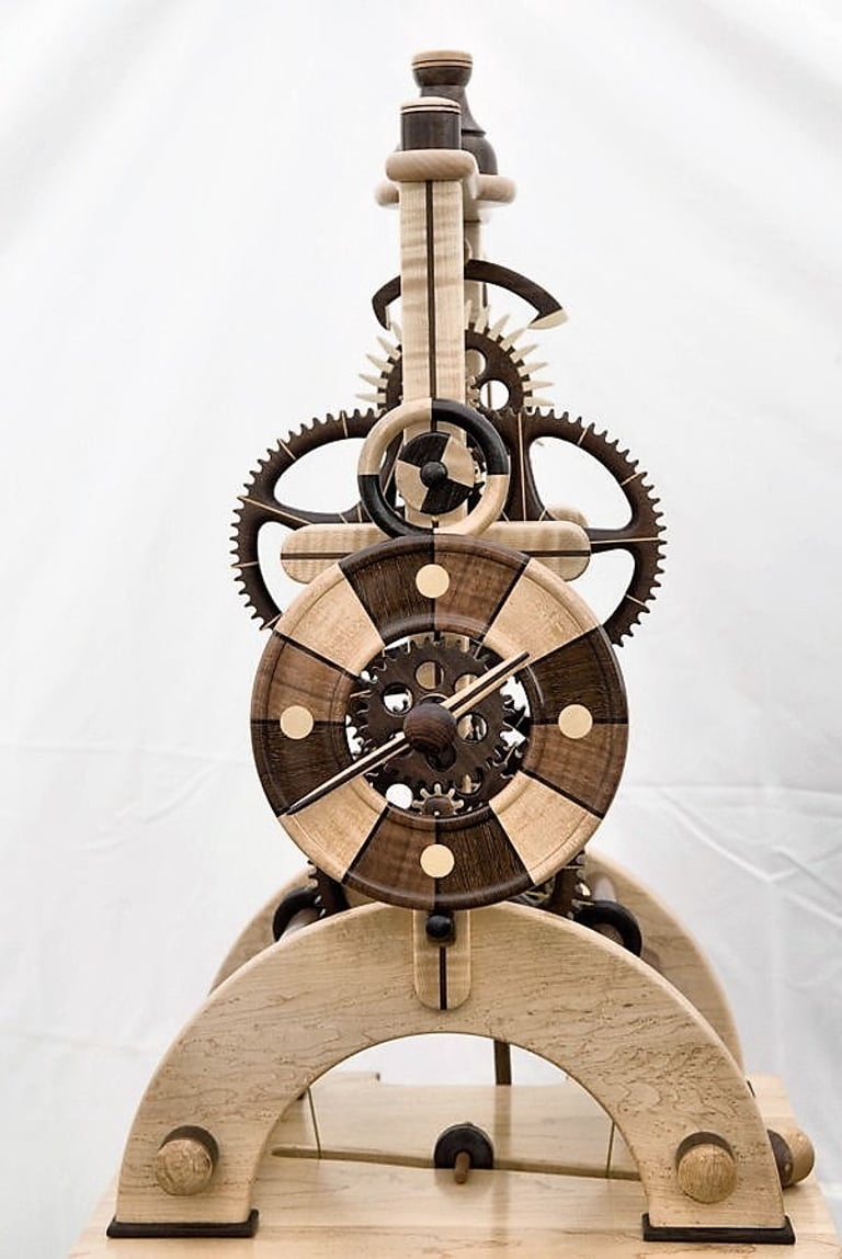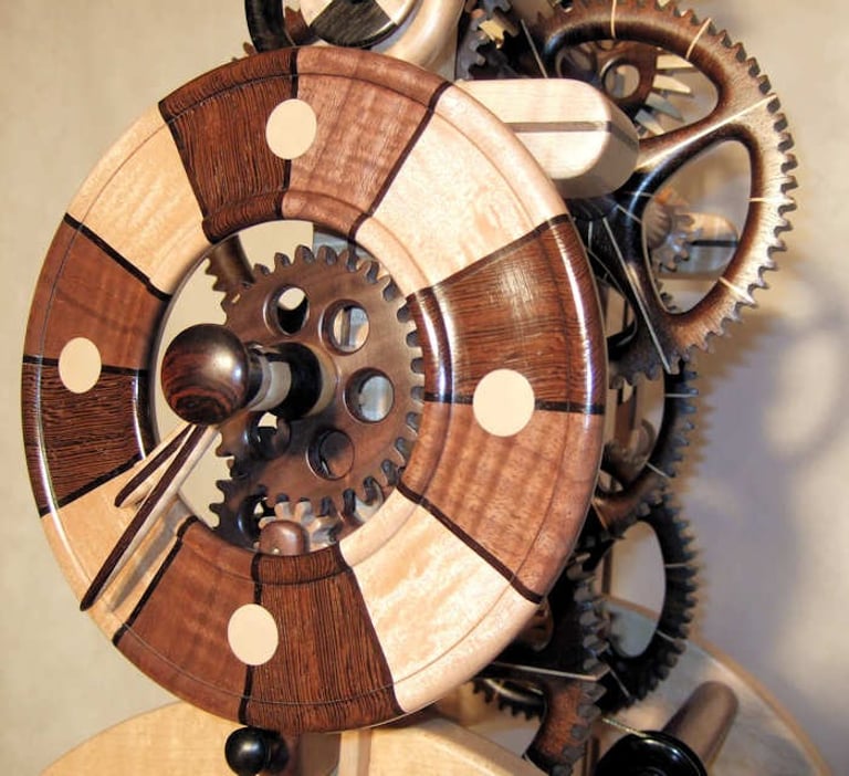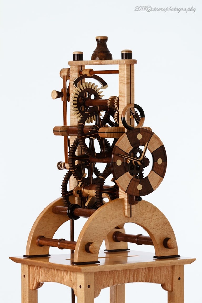 I call this clock Brown Sugar because the chocolate tones in the various wood combinations looks like, well, Brown Sugar! This clock was a collaborative effort with a local Rochester resident. The colorful pendulum bob was a throw away until the owner saw it in the trash and decided, it's perfect! I was hesitant to include it but, after a few days it grew on me. I like it!