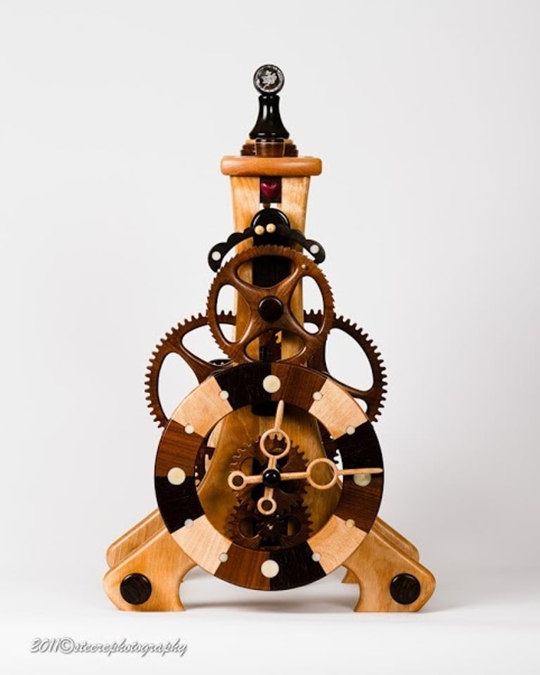 M-9 Electro Mahogany, Ebony, Maple, Palm nuts (clock face) and crystal glass (topper).