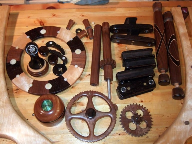 This is the only shelf clock that I have built. It is a anniversary gift that I made for a fellow naval officer. The pendulum operates by magnetic impulse which drives the ratchet mechanism above the escape wheel. The crystal in the topper was a rare find. I has a love message engraved into it. The numbers on the face are inlayed rounds of palm nuts that look amazingly like pearls.