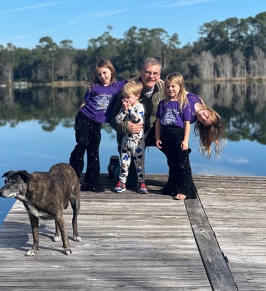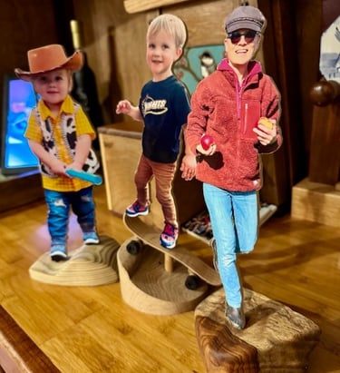 Spent a few days in DeLand, FL with daughter and grandkids. Pictured are kids at the dock's end, backyard palms at the lake's edge and some woodies that I made for 3 year old Wyatt. I kept the woodie of Pat, my wife!