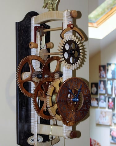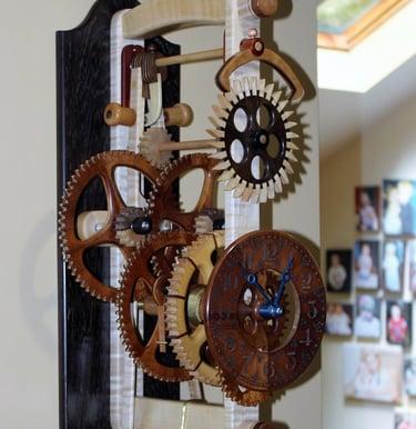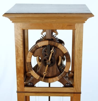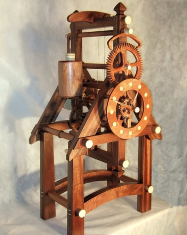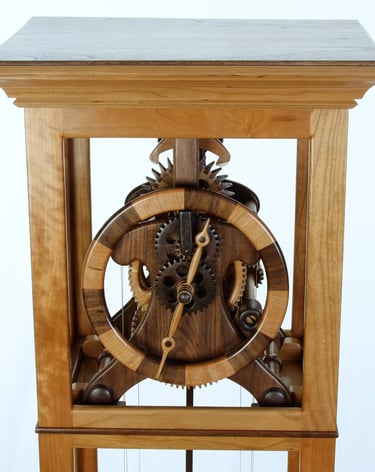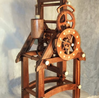 You may ask, where is the M1? The M1 did exist and, along with the M2, was used as a training project when I first started learning how to design and build a wood wheels clock. By popular demand I kept the M2 alive. Neither the M1 or M2 were slated for a show room! In fact, I destroyed the M1 fearing that I might be judged by its appearance. Trust me, it was not ready for a public viewing! The M2 does have beautiful woods in its construction and I was convinced to allow it to survive!